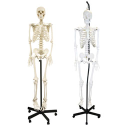 This full-size human skeleton is a great instructional aid for teaching anatomy. Bones are cast individually from naturally colored plastic with anatomical detail. Both the arms and legs are removable for further study. The skull features movable jaw, removable skullcap, suture lines, and a full dentition. All movable parts are joined by connectors, and utilized in such a way to allow movement around the joint. Comes on a roller base and supplied with a diagram.