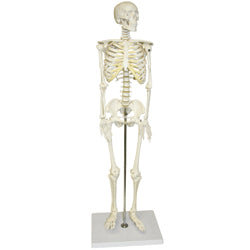 An exceptional price for this three-foot plastic skeleton on a heavy metal stand. This affordable teaching skeleton is wired for natural movement and highlights a removable skull with the calvarium cut. Mandible hinged with springs in place to examine TMJ problems. Arms and legs are held on by small screws, making it easy to bend the extremities in all directions. All of the bones are cast individually, except in the hands and feet. Labeled diagram included.
