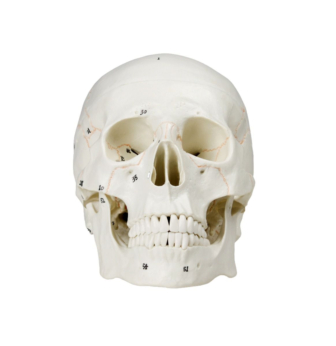 This classic human skull is numbered to help identify the key structures of the human skull. Skull sutures, fissures, foramina, and processes are drawn and clearly defined to make the anatomy of the human skull easy to teach and learn in any setting. The skullcap and mandible can be removed. Corresponding key card is included.