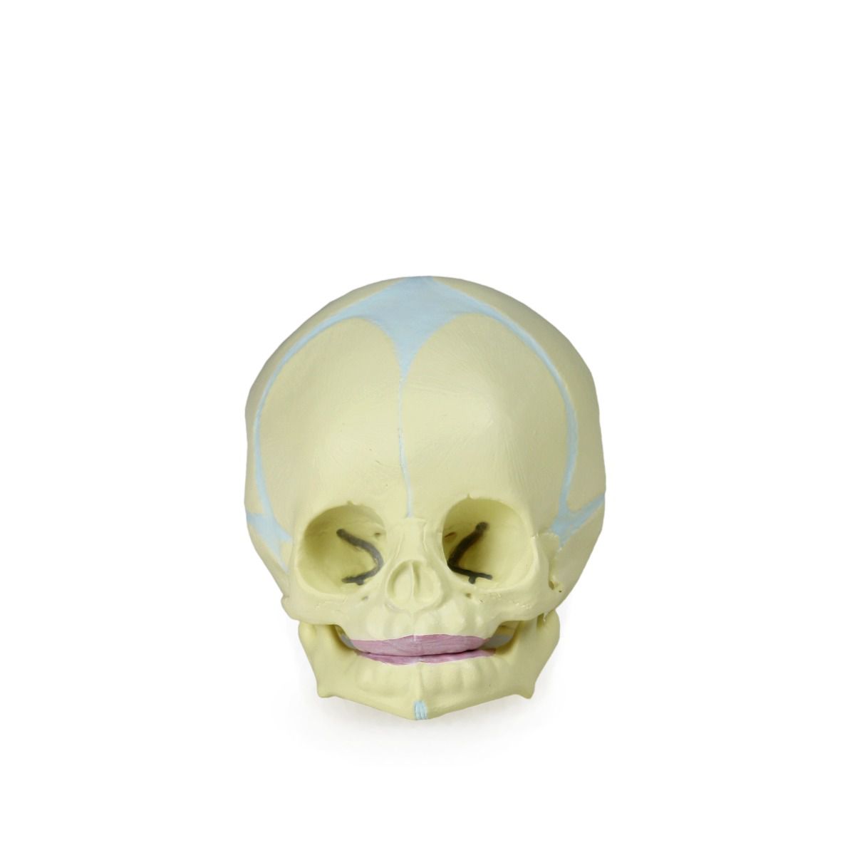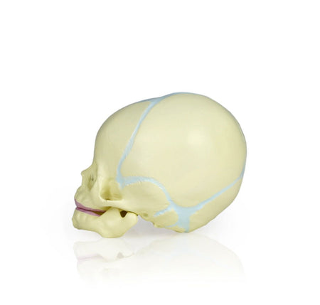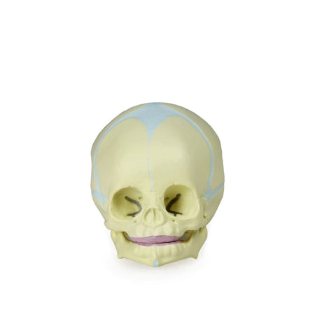 This human fetal skull shows the characteristics of prenatal development during the 30th week of pregnancy. The fontanelle, which becomes bone over time is visible and allows students to study the anatomy of the fetal skull with ease. Mounted on a durable base with movable jaw.