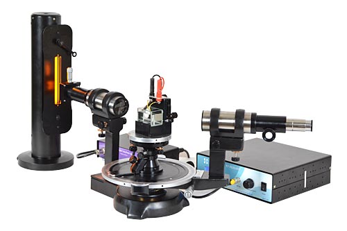 The ultrasonic waves generated by the transducer travels through the medium (liquid) and get reflected at the side by side (flat glass plate) of the cell. The incident and reflected waves interfere and a stationary / standing wave pattern is formed. Piezo electric crystals are mounted using a kinematic holder at the center of Goniometer. This helps to direct the sodium light through the liquid and then to the detector/eyepiece conveniently by using the spectroscopic arm design. The diffraction pattern is changed by replacing the crystals like 3 MHz to 5MHz.The velocity of ultrasonic waves in liquids can be calculated from this experiment.