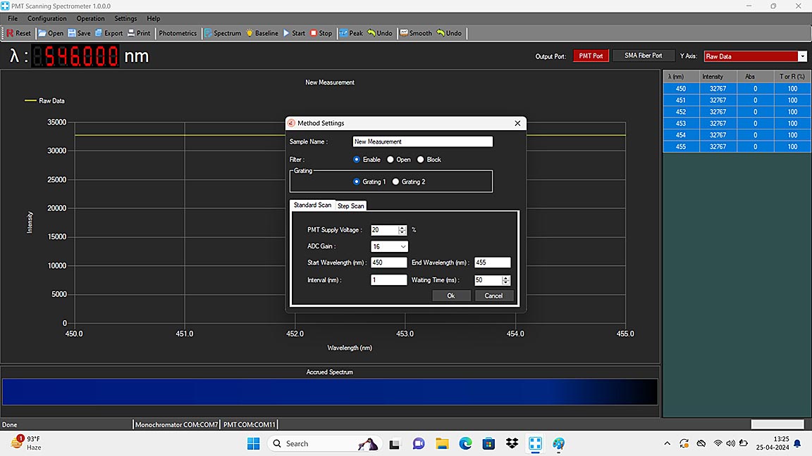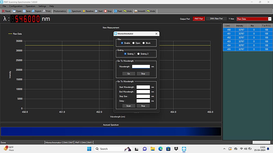 Our HO-SP-SQR300FA is our spectra monochromator with PMT detector which can be used as a PL system, which makes use of photoluminescence to measure the quantum yield of a material quickly and accurately. Our system consists of an excitation source, a monochromator and a photomultiplier tube as the spectrometer detector. It has a Czerny-turner optical path configuration; a plane holographic grating is used to diffract the input light. Use of holographic grating minimize the stray light for high sensitivity and accuracy. A stepper motor-controlled sine drive positions the grating, which is mounted on a precision rotary table. The sine drive delivers a linear relationship between stepper motor motion and wave- length of interest. Also, it includes a mechanism to change the wavelength selected by software and to record the resulting changes as a function of wavelength.