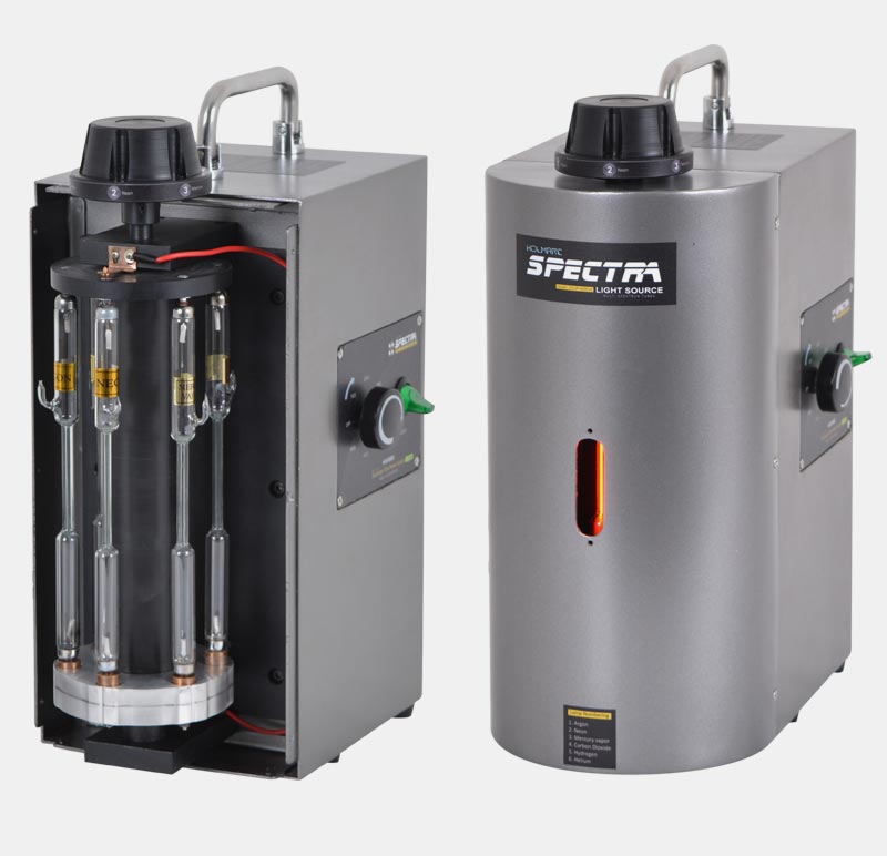 Holmarc’s Multi Spectrum Tube Housing holds six spectrum discharge tubes simultaneously. It can quickly switch from one gas to another without displacing the lamp housing. Power supply is common for all discharge tubes, kept inside the unit.