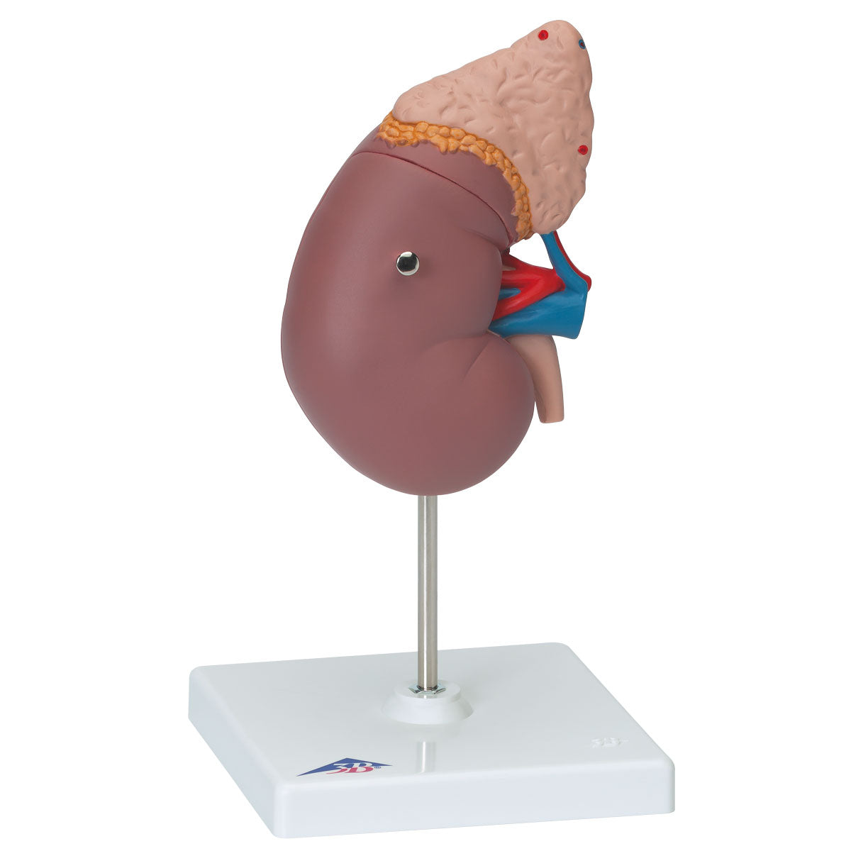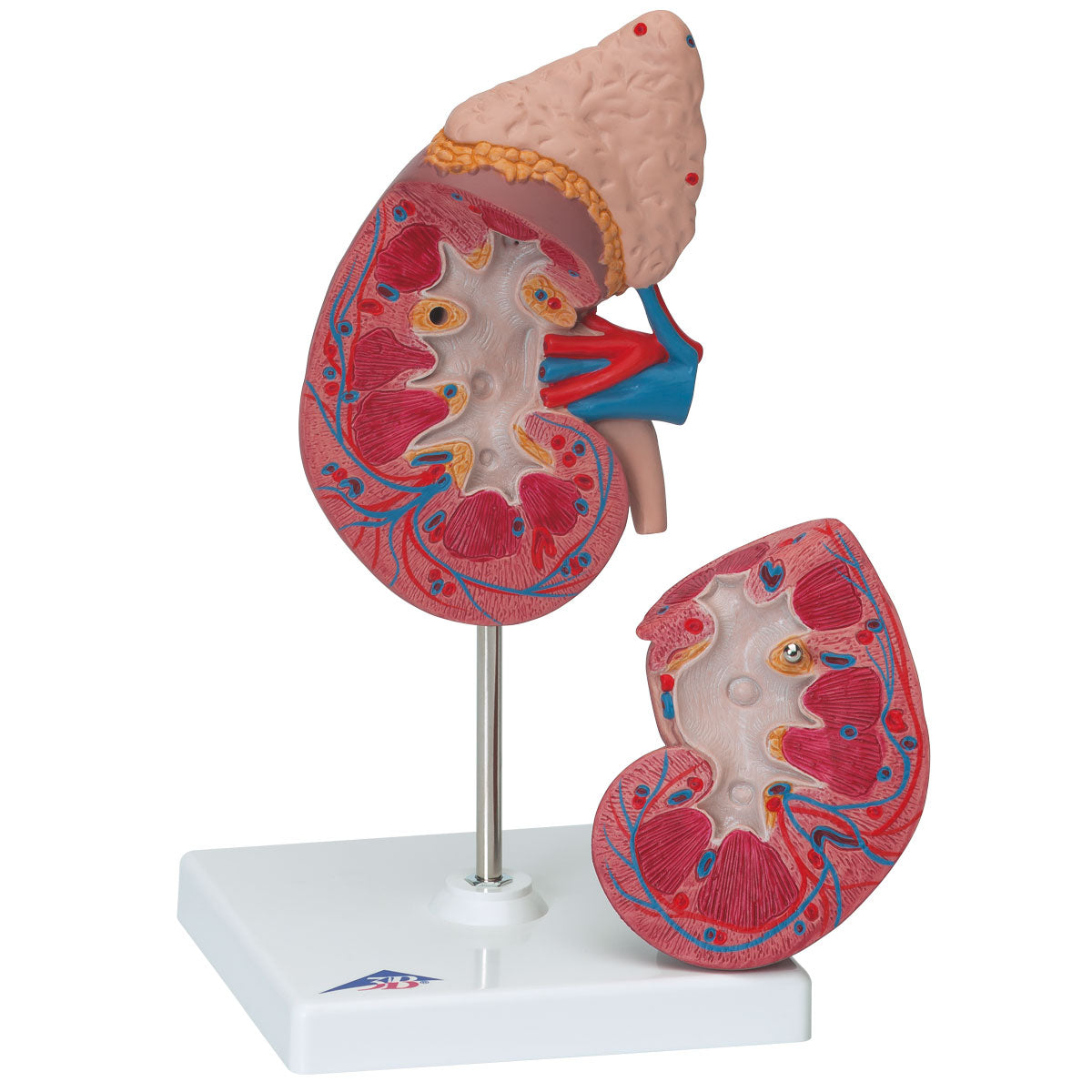 The front half of the kidney is removable to enable demonstration of cortex medulla and vessels for teaching about the human kidney. The renal pelvis of the kidney is also displayed. 20 important structures of the human kidney are included in the anatomy key. Kidney with adrenal gland model comes on stand.