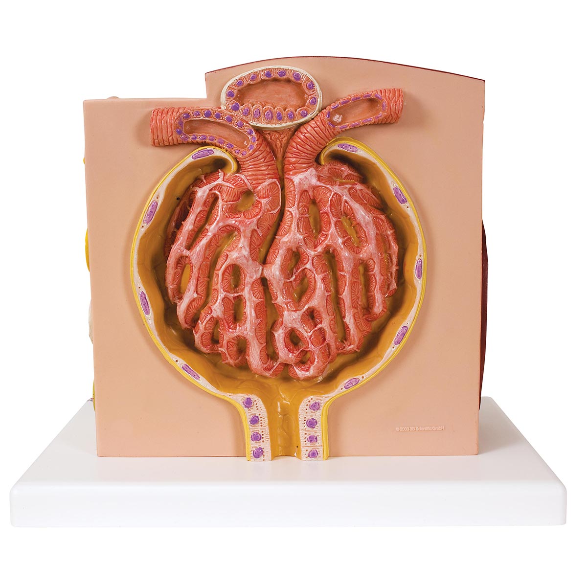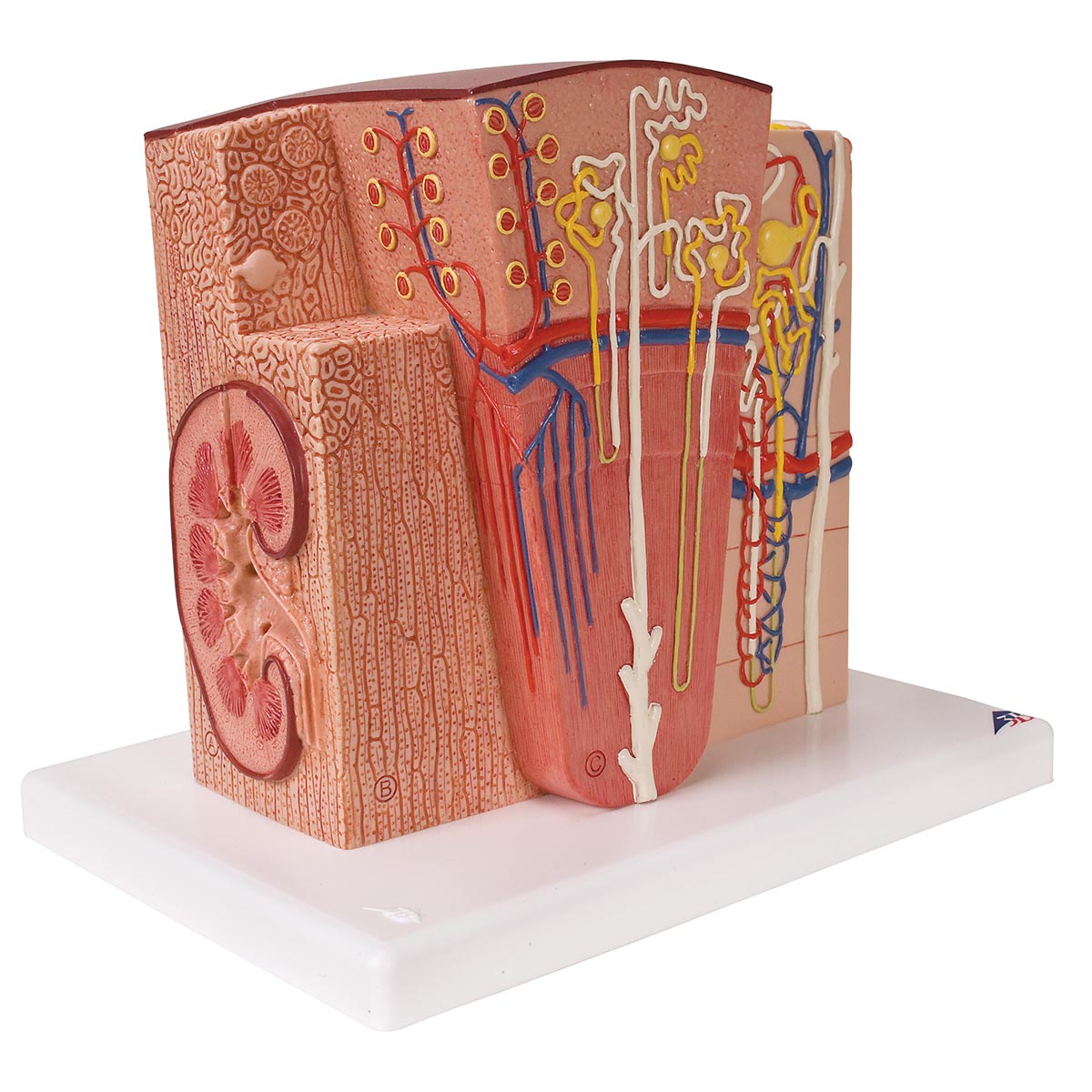 The 3B MICROanatomy™ Kidney is an extremely detailed model which shows the morphologic/functional units of the kidney. The kidney structures are greatly magnified. Six model zones illustrate the following fine-tissue structures of the human kidney that serve in the production of urine:
