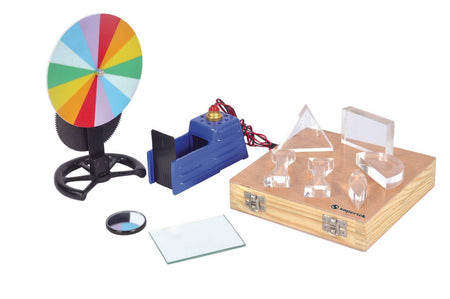 Simple kit that helps explain students the principle of reflection and refraction. Using mirrors, lenses, acrylic prism set and a ray box, light can be reflected and refracted in different ways. The acrylic prism set includes a triangular, half-round, double convex and rectangular prism and two double concave prisms all packed in a wooden storage box. A Newton color disc is also provided with this set. The color disc illustrates an important property of light that white light is composed of seven colors. With instructions.