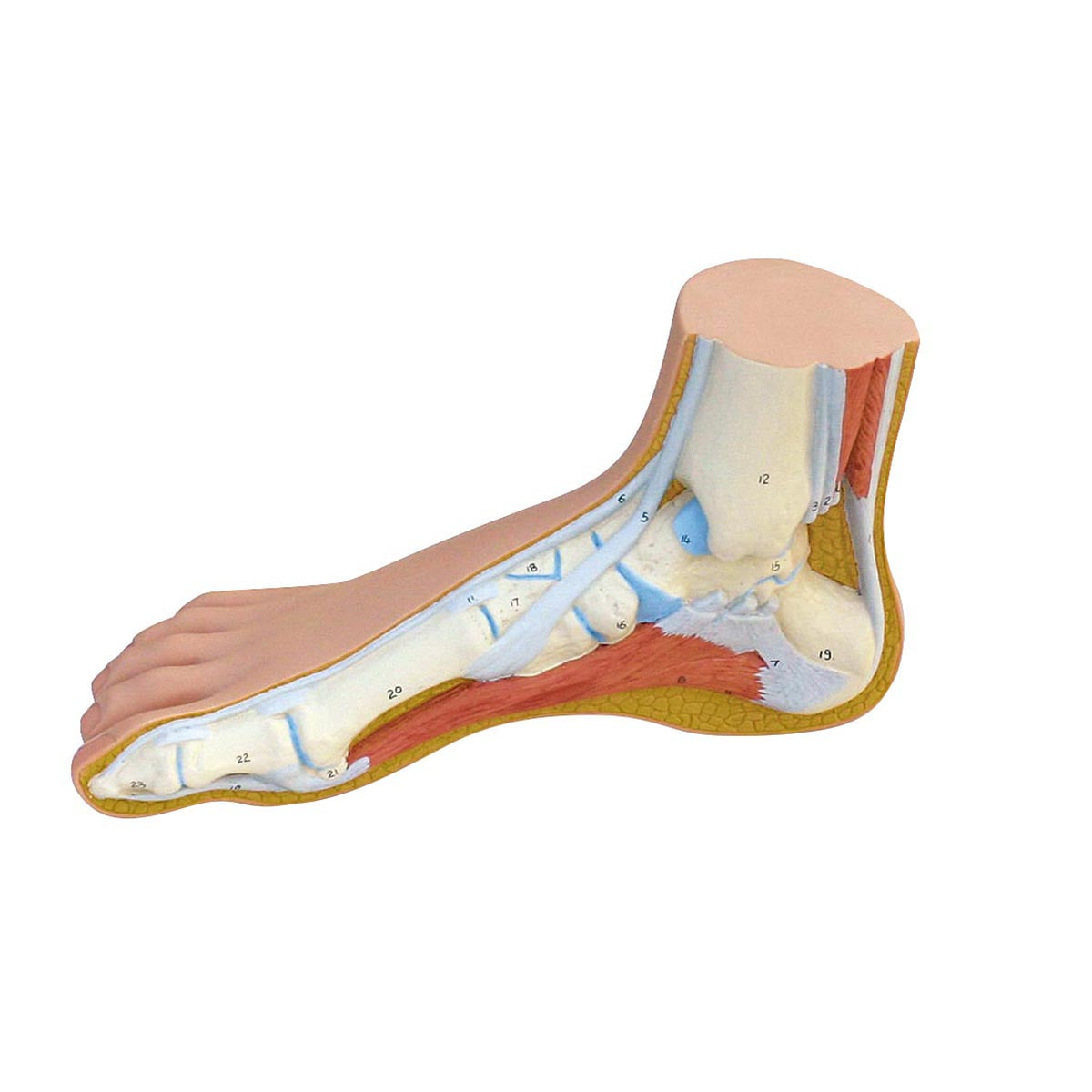 Superficial structures of the human foot are shown in this high quality model. The internal bones, muscles, ligaments and nerves are also represented in this normal foot skeleton. See the anatomy of the human foot!