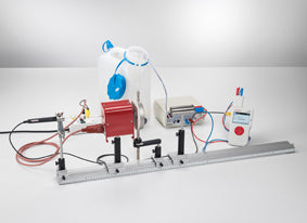 In the two experiments P5.5.2.1 and P5.5.2.2, a cylindrical electric oven with a burnished brass cylinder is used as a “black body”. The brass cylinder is heated in the oven to the desired temperature between 300 and 750 K. A thermocouple is used to measure the temperature. A water-coolable screen is positioned in front of the oven to ensure that the setup essentially measures only the temperature of the burnished brass cylinder. The measurement is conducted using a Moll’s thermopile; its output voltage provides a relative measure of the radiated power M. The thermopile can be connected via the µV box, either to Mobile-CASSY or to the CASSY computer interface device. In the former case, the measurement must by carried out manually, point by point; the latter configuration enables computer-assisted measuring and evaluation. The aim of the evaluation is to confirm Stefan-Boltzmann’s law.COMPONENTS OF EQUIPMENT SETS: