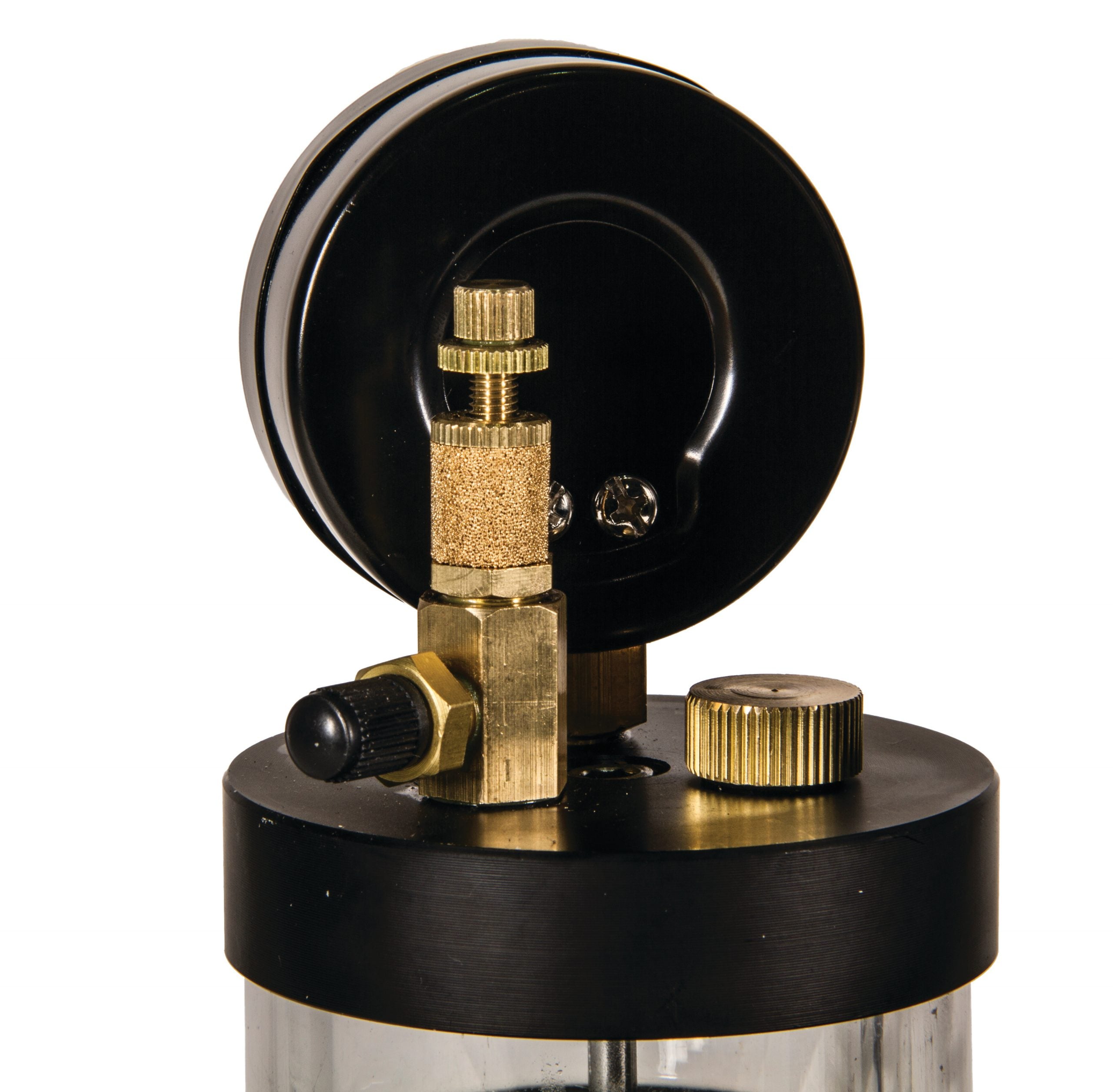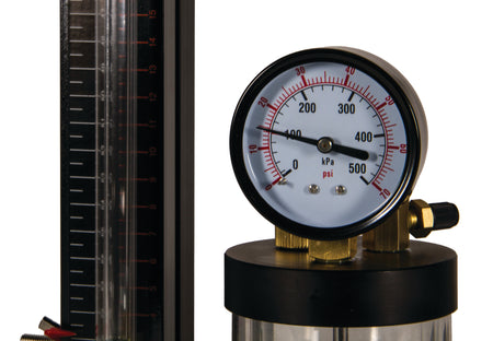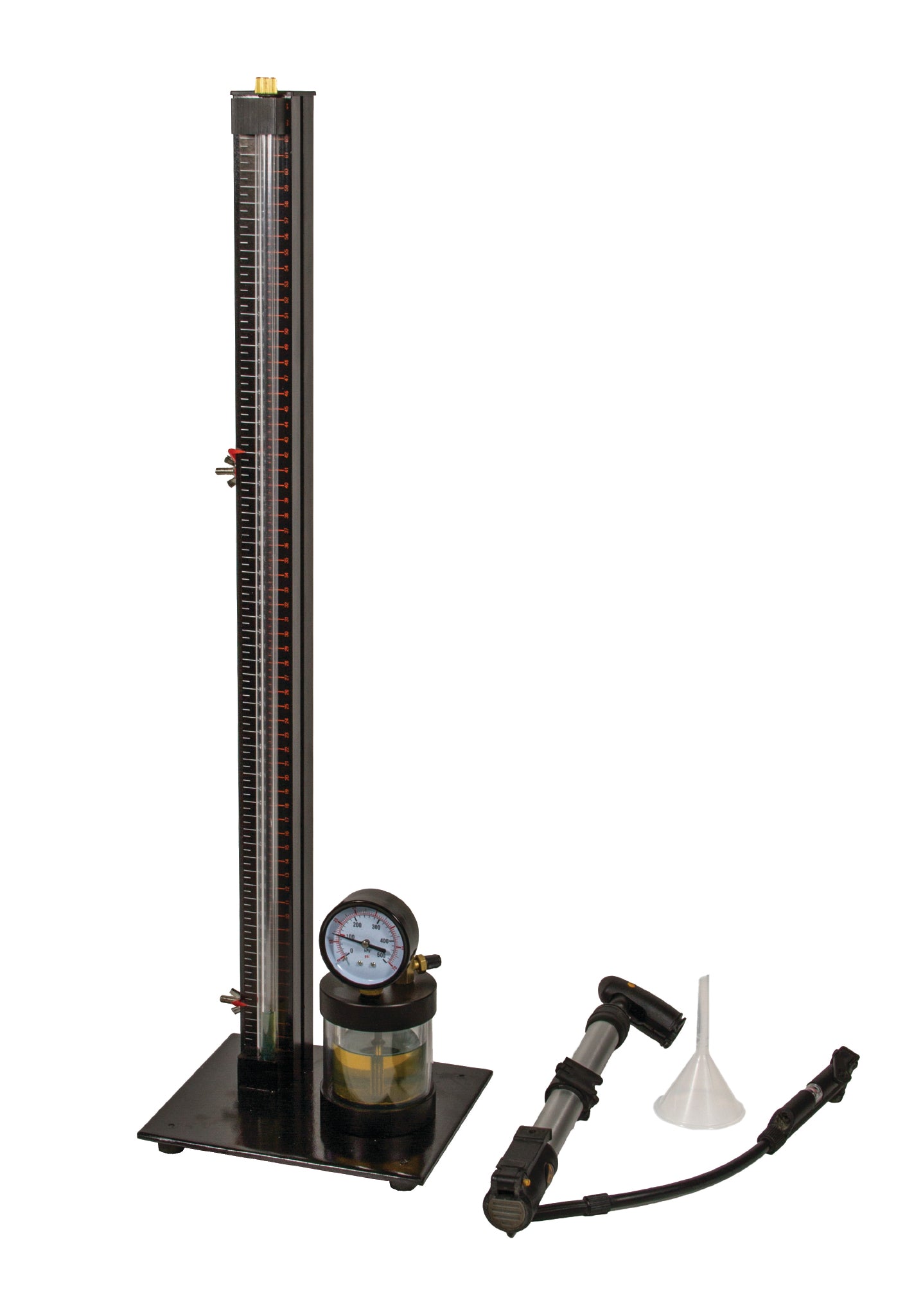 Pressure is applied using a supplied high pressure bicycle pump, which allows precise fine control for making a large series of measurements or for using the volume proportions method. A needle valve allows for controlled pressure release and a vent knob is provided for the tube.