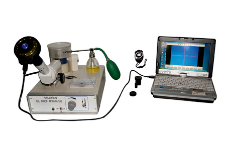 Compact apparatus for demonstrating the discrete nature (quantization) of electric charge and for determining the elementary charge of an electron. Comprising an experiment chamber kit for assembly with plate capacitor and oil atomizer, lighting unit with LED, measuring microscope, voltage adjustment knob and switch to set the capacitor voltage.